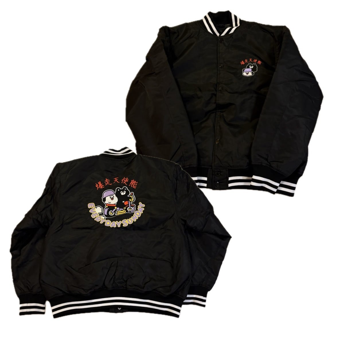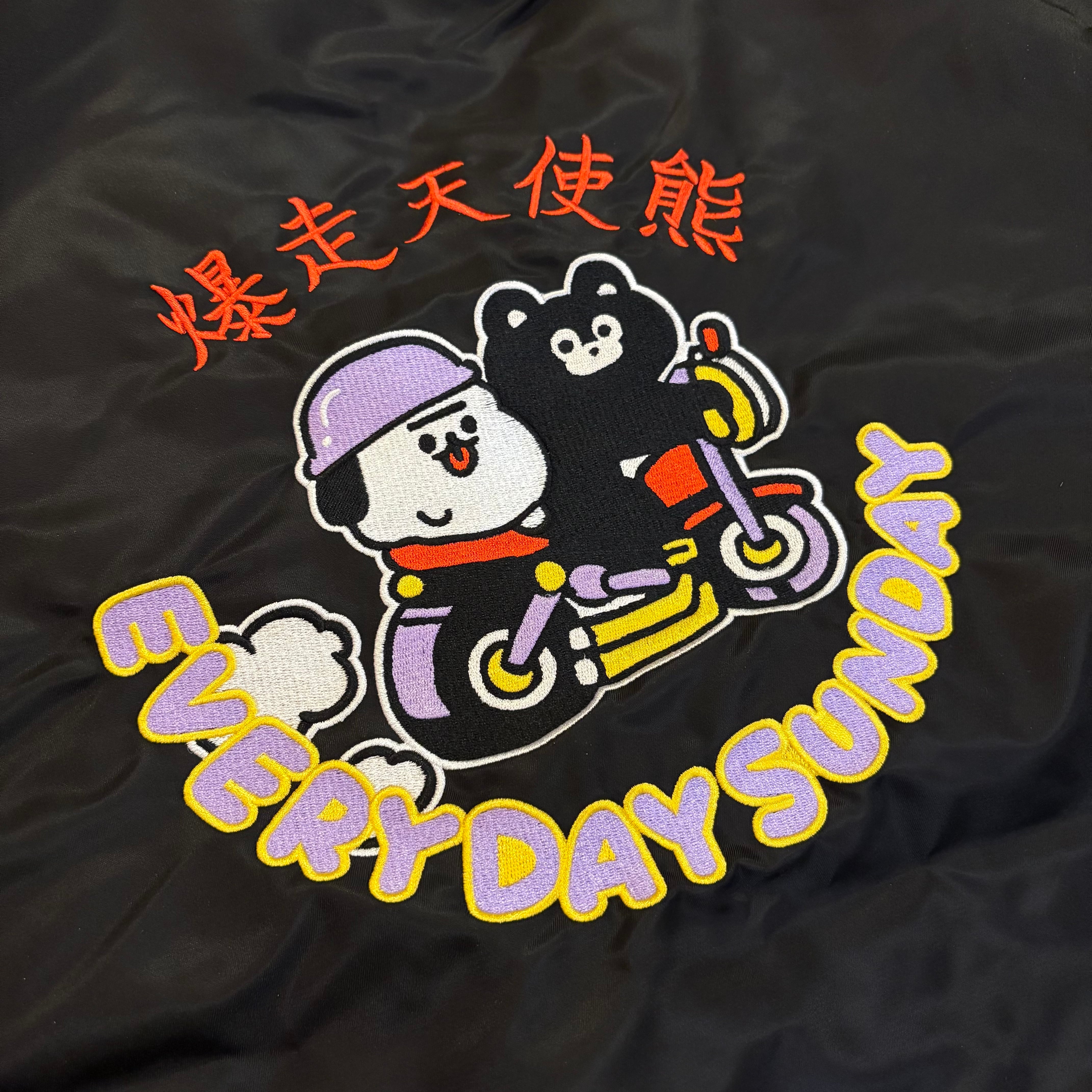 爆走天使熊(ミッドナイトエンジェルまーくん)スタジャン 左胸にモンモにメットをかぶせてあげるまーくん刺繍 バックはバイクに乗るモンモとまーくんです。 あったかっこいい(あったかいしかっこいいしかわいい)